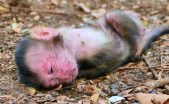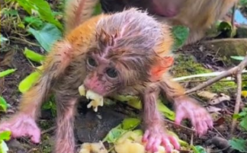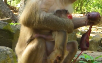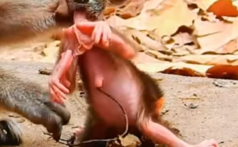 A poor newborn monkey cries helplessly in the quiet forest, its tiny body trembling after a difficult birth. The fragile baby is so weak that it cannot even hold tightly …