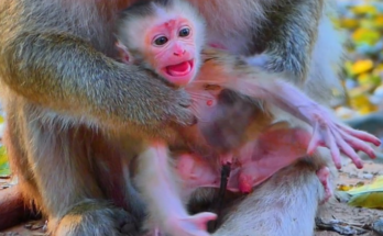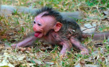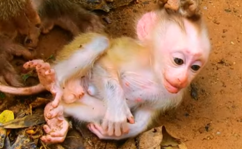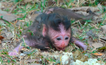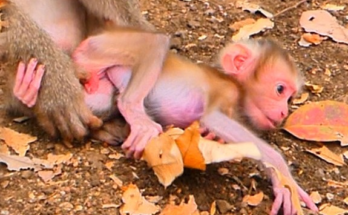 In the quiet warmth of the forest morning, a tiny newborn baby monkey lies close to its resting mother, its fragile body barely strong enough to move. With gentle, trembling …