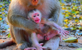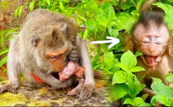 In a heartbreaking moment deep in the forest, a tiny baby monkey struggles to nurse from its mother. Weak and hungry, the little one reaches for milk, hoping for comfort …