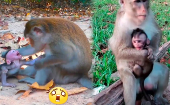 Under the cold, relentless rain, a heartbreaking scene unfolds as an old monkey harshly strikes a helpless baby monkey. The tiny creature cries out, shivering and confused, seeking comfort but …